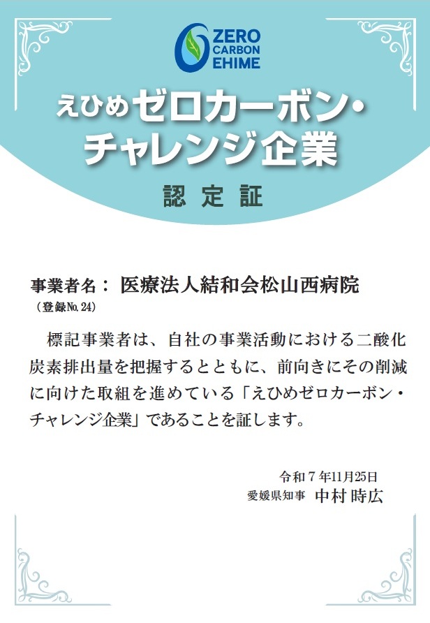 「えひめゼロカーボン・チャレンジ企業」に認定されました 更新日:2026/01/14 10:14 カテゴリー: 日常におけるエネルギーの効率化・節約に係る取り組みを評価され、えひめゼロカーボン・チャレンジ企業に認定されました。